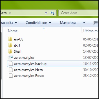 | 7. Ora portiamoci nel menu File e selezioniamo Save. Automaticamente sul desktop apparirà il file ricompilato e una copia di backup nominata aero_original.msstyles che possiamo anche eliminare. 8. Portiamoci in C:\\Windows\\Resources\\Themes\\Aero clicchiamo con il tasto destro del mouse su aero.msstyles e rinominiamolo in “.Backup”. Incolliamo il file personalizzato e riavviamo il sistema. NOTA: Nel caso vogliate personalizzare il colore della Fascia come nelle immagini basterà seguire la procedura descritta in questo articolo. | ||