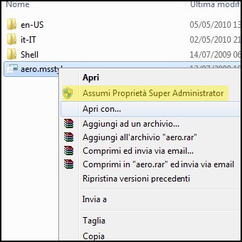 | 3. Ora portiamoci in C:\\Windows\\Resources\\Themes\\Aero. Clicchiamo col tasto destro del mouse sul file aero.msstyles e selezioniamo la voce Assumi Proprietà Super Administrator per avere il pieno controllo ed effettuare le modifiche necessarie senza dover seguire nessuna regola o permesso. Per non lavorare direttamente sul file originale copiamo e incolliamo aero.msstyles sul desktop. 4. Scarichiamo Resource Hacker e con un doppio clic lanciamo l’eseguibile ResHacker.exe. Dal menu File/Open selezioniamo la copia di aero.msstyles e clicchiamo sul pulsante Apri. Espandiamo la cartella IMAGE, individuiamo ed esportiamo le seguenti immagini: