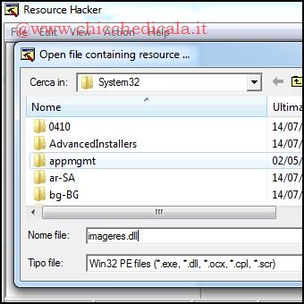 | 4. Scarichiamo Resource Hacker e con un doppio clic lanciamo l’eseguibile ResHacker.exe. Dal menu File/Open portiamoci in C:\\Windows\\System32, nella casella “Nome File:” digitiamo imageres.dll e clicchiamo sul pulsante Apri. | ||