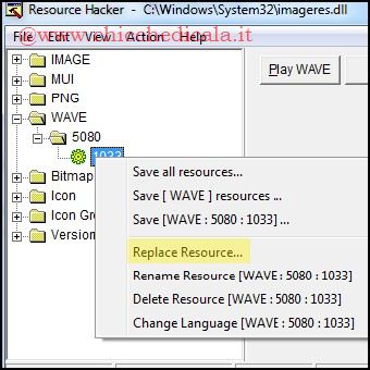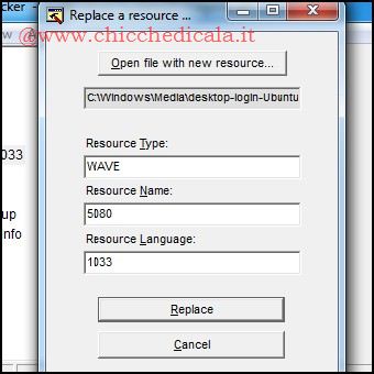 | 5. Espandiamo la cartella WAVE/5080, evidenziamo la voce 1033, clicchiamo col tasto destro e selezioniamo “Replace Resource…” 6. Clicchiamo sul pulsante “Open File With New Resouces…” e carichiamo il file “desktop- login-Ubuntu.wav” posizionato in C:\\Windows\\Media. Ora ricompiliamo la DLL digitando WAVE nel campo Resources Type, 5080 nel campo Resource Name, 1033 nel campo Resource Language e clicchiamo Replace. | ||