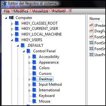 | 1. Premiamo contemporaneamente i tasti Windows + R. Scriviamo la parola regedit e clicchiamo su Ok. Si aprirà una finestra divisa in due colonne. Questo è il registro di configurazione. Nella sezione di sinistra vengono elencate le chiavi di registro, mentre in quella dì destra i valori assegnati a ciascuna chiave. 2. A sinistra notiamo subito una struttura ad albero, in cui ogni chiave presenta diverse sottochiavi a loro volta divise in altri sottolivelli. Cerchiamo la cartella HKEY_USER\\DEFAULT\\ControlPanel\\Desktop e clicchiamoci sopra. | ||