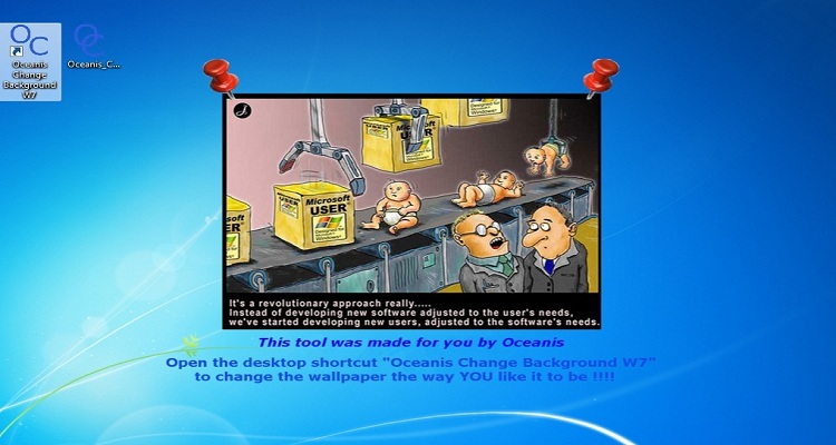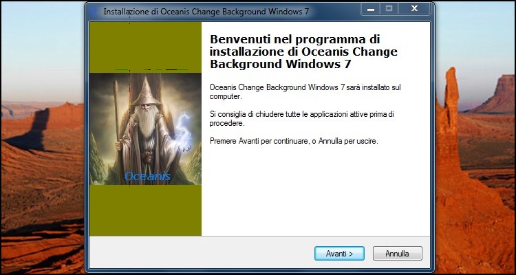 | 1. Scarichiamo Oceanis Change Background, scompattiamo il contenuto sul desktop e lanciamo l’unico eseguibile disponibile. Successivamente selezioniamo la lingua Italiana e proseguiamo con l’installazione guidata. Al termine riavviamo il sistema per rendere effettive le modifiche. 2. Al riavvio del computer vedremo lo sfondo mostrato in figura, per sostituirlo clicchiamo sull’icona analoga al programma. | ||