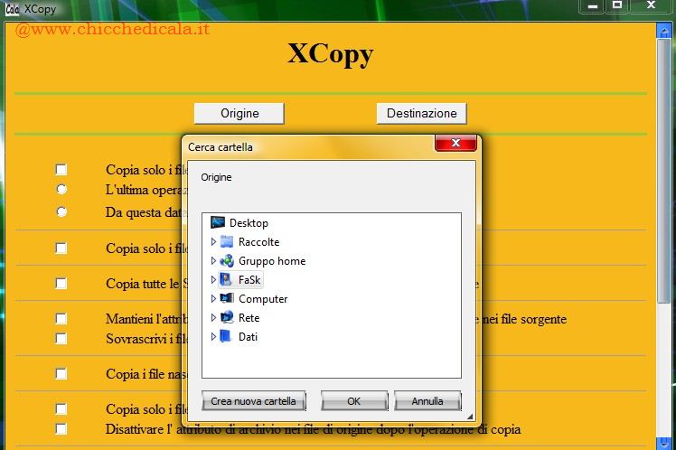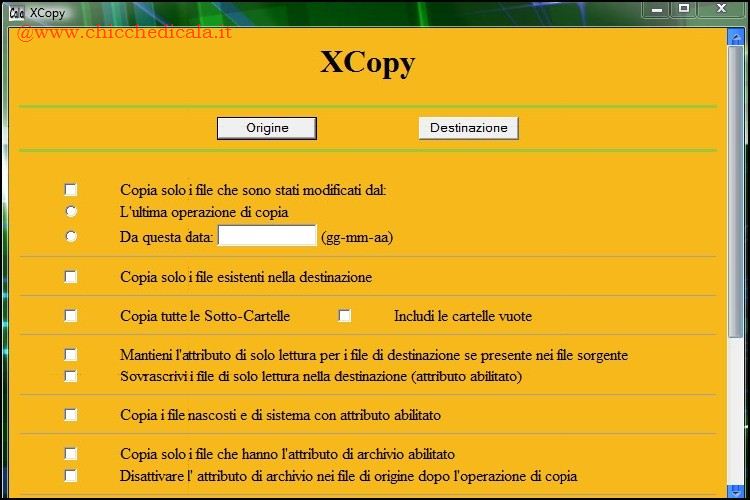 | Il comando xcopy è stato espressamente progettato per l’esecuzione di operazioni di copia e può copiare gruppi di file, \t\tnonché tutte le directory contenente file e le sottodirectory. Inoltre, il comando XCOPY è dotato di una lunga lista di parametri che vi permetterà di eseguire facilmente una vasta gamma di operazioni per l’elaborazione di copie di file. Ad esempio può copiare una struttura di cartelle ma non i file o escludere alcuni file espressamente indicati. | ||