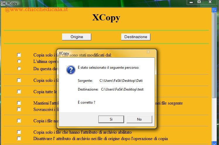| 3. Una volta selezionata la cartella d’origine e di destinazione, verrà visualizzata una finestra di conferma, come quella mostrata in Figura. Se si sceglie “Si“, sarete pronti per iniziare a selezionare le opzioni, mentre scegliendo “No“, sia l’origine che la destinazione sarà resettata per iniziare una nuova operazione. È quindi possibile scegliere una delle opzioni disponibili e premere “OK” nella parte inferiore della finestra. Quando si sceglie OK, viene visualizzato un Prompt dei comandi, e XCopy andrà a lavorare in modo rapido ed efficiente per il trasferimento dei file. | ||