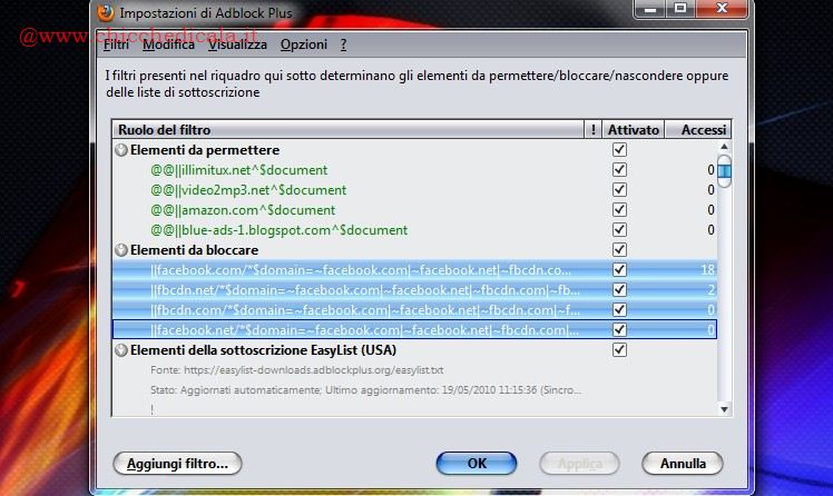 2. Successivamente dovremo aggiungere i filtri all’estensione AdBlock. Per chi non la conoscesse Adblock, scaricabile da questo indirizzo, è un add on per il browser Mozilla Firefox. Una volta installato il programma blocca selettivamente le finestre pubblicitarie e le pop up che molto spesso si aprono automaticamente quando si accede a determinati siti web. Per inserire i filtri andiamo nelle Impostazioni dell’estensione e clicchiamo sul pulsante “Aggiungi Filtro“. Nella casella inseriamo uno alla volta i filtri elencati in seguito. Successivamente clicchiamo Applica/OK.