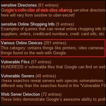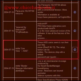 | 1. Per scovare l’elenco delle Webcam accessibili via Internet, basta collegarsi al sito ihackstuff.com e cliccare su Google Hacking Database. Si apre una nuova pagina con link divisi per categoria. Per visualizzare l’elenco delle IPCam è sufficiente cliccare su Various Online devices. 2. Scorrendo l’elenco dei dispositivi connessi in Rete (comprese anche alcune stampanti) se ne sceglie uno contrassegnato da un gran numero di faccine, ossia quello ritenuto più interessante sia da chi le ha scoperte sia dalla comunità che fa riferimento al sito. Nell’esempio, la stringa utilizzata è utile: “Live View / – AXIS“. | ||