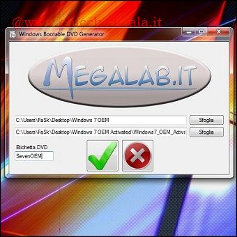| 4. Ora non gli rimane che rendere nuovamente Bootable il file ISO. Le possibilità sono molteplici, possono utilizzare Nero seguendo questa guida, o semplicemente scaricando il tool Windows Bootable DVD Generator, progettato da Zane di Megalab.it. Selezionano la cartella sorgente e quella di destinazione, assegnano un etichetta al DVD e danno il via alla creazione della ISO cliccando sull’icona rappresentata da una “V“. NOTA: La cartella di origine e quella di destinazione devono essere differenti, diversamente il tool potrebbe incontrare difficoltà nella generazione del file ISO. 5. Una volta avviata la procedura sarà questione di pochi minuti prima che l’Hacker abbia modificato il file ISO in versione OEM. | ||