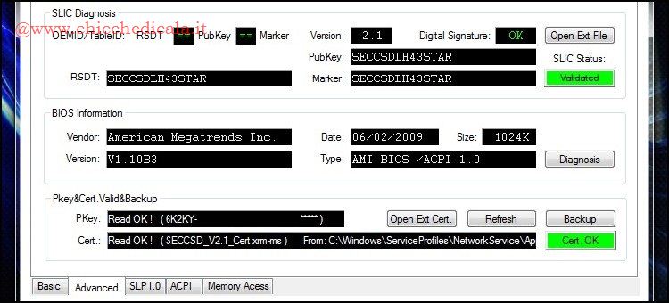 | 1. Quindi per poter procedere gli hacker hanno bisogno di verificare il tipo di SLIC che utilizza il PC. Per farlo utilizzano il software SLIC Toolkit V3.2, avviano il programma con un doppio clic sull’eseguibile SLIC_Toolkit_v3.2.exe, si spostano nel Tab Advanced e dalla sezione SLIC Diagnosis verificano la versione in loro possesso. Per un’analisi più approfondita l’hacker seguira la procedura descritta in questo articolo. In caso la versione corrisponda alla 2.1 procedono col passo successivo, in caso contrario si portano sul forum Mydigitallife, verificano l’esistenza di una versione moddata del proprio BIOS e procedendo con il Flash del BIOS seguendo questa guida. NOTA: Nel caso non esista il BIOS moddato l’Hacker inoltra una richiesta aprendo un thread in questa sezione e raccogliendo le informazioni necessarie descritte in questo articolo. Volendo gli hacker più temerari provvedono a modificare lo SLIC del BIOS in maniera del tutto autonoma seguendo questo articolo. | ||