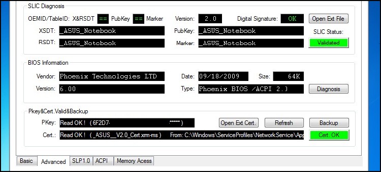 | 1. A differenza di questa tecnica, non avranno la necessità di aggiornare il BIOS con SLIC 2.1. Nonostante questo, per pura formalità verificheranno la versione in loro possesso utilizzando il software SLIC Toolkit V3.2. Scompattato l’archivio avvieranno il programma con un doppio clic sull’eseguibile SLIC_Toolkit_v3.2.exe, si sposteranno nel Tab Advanced e dalla sezione SLIC Diagnosis verificheranno la versione. (in questo esempio SLIC 2.0) | ||