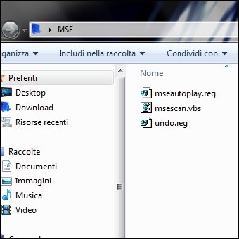 | 1. Scarichiamo l’archivio mseautoplay.zip e scompattiamo il contenuto sul desktop. All’interno della cartella troveremo due chiavi di registro e lo script .VBS. Spostiamo il File msescan.vbs all’interno della directory Windows (C:\\Windows). Nel caso avessimo abilitato il UAC rispondiamo Continua/SI per confermare l’operazione di spostamento. \t NOTA: La chiave Undo.reg serve per eliminare la chiave di registro in caso di necessità. 2. Fatto ciò, con un doppio clic uniamo la chiave mseautoplay.reg al registro di sistema e, nelle due finestre successive rispondiamo SI/OK. Terminata l’operazione inserendo un qualsiasi supporto di storage visualizzeremo la finestra AutoPlay dandoci la possibilità di effettuare una scansione. | ||