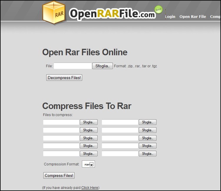 | Capita a volte di lavorare con il PC di amici, parenti o colleghi e di accorgersi, solo dopo il download di un archivio compresso, che sul computer non è installata l’applicazione per la gestione dei file compressi. Se per diversi motivi non si vuole installare sul pc un programma come Win Rar,7zip… basta usare un servizio chiamato OpenRARfile.com. Questo sito consente di aprire e creare online archivi compressi come ZIP, TAR, RAR o TGZ e di scaricarne il contenuto sul proprio pc. Per questo servizio non è richiesta la registrazione o installazione di software aggiuntivi. Open RARfile.com è particolarmente consigliato per l’uso da pc pubblici (biblioteche, uffici, scuole..) sui quali è vietato installare qualsiasi applicazione. | ||