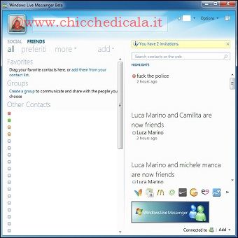 LE NOVITA’ DI WLM 2010 BETAUna volta che Windows Live Messenger 2010 è installato e funzionante, ed è stato avviato, non resta che scoprirlo in tutta la bellezza della sua interfaccia. Tra i pochi fortunati, e temerari, :he lo hanno provato, c’è chi maligna che le novità sono poche, e per lo più estetiche. Ma le cose, in realtà, non sono così. Messenger, infatti, cambia fin dai suo “cuore”, vale a dire la tecnologia interna che lo aziona, beneficiando anche di ritocchi che fanno la felicità degli appassionati di social network, come Facebook. Il nuovo Messenger, in effetti, richiama l’impostazione di questi servizi, arricchendo la sua storica interfaccia con un flusso continuo di contenuti, e la possibilità di accedere facilmente a quelli di un contatto specifico. Senza contare che Microsoft è alacremente al lavoro per aggiungere nuove funzioni prima del lancio ufficiale del suo annunciato gioiello. Del resto stiamo parlando di una versione che nessuno dovrebbe aver nemmeno visto… | ||