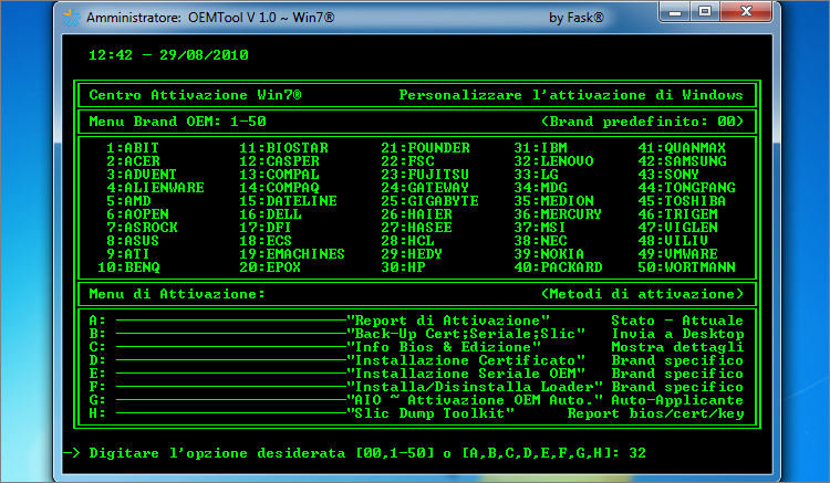 | Come prima cosa per utilizzare il programma è necessario disabilitare il UAC. Per farlo basterà aprire il menu “Start” e nella casella di ricerca digitare “UserAccountControlSettings.exe” seguito da “Invio”. Successivamente basterà disabilitarlo impostando il cursore su “Non notificare mai” e riavviare il sistema. In seguito l’Hacker lancerà OEMTool come amministratore. Per farlo cliccherà con il tasto destro sull’eseguibile e selezionerà “Esegui come Amministratore” dal menu contestuale. 1. Dall’interfaccia principale sceglierà il brand desiderato dall’apposito menu (Menu Brand OEM) e digiterà il numero corrispondente seguito da Invio. | ||