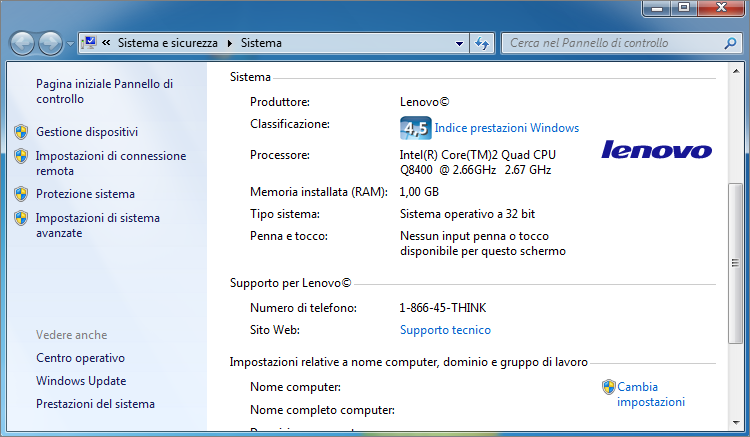 | 3. Terminata la procedura si porterà nella finestra Proprietà di Sistema premendo la combinazione di tasti WIN + Pausa, (La combinazione funziona solo col tasto F-Bloc disattivato) e verificherà che il logo e le varie sezioni (Supporto e Produttore) siano state aggiunte correttamente. | ||