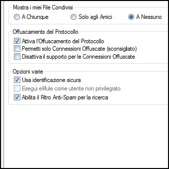 | 3. In eMule è presente la funzione di Offuscamento del Protocollo tra altri client o server eMule. Quando è \t\tattiva, il traffico di rete generato risulta come un flusso di dati casuali (è un accorgimento utile nel caso in cui il provider filtra il traffico di eMule). Nelle impostazioni di default di eMule, tale funzione è già selezionata. Ad ogni modo, per controllare che sia attiva, andiamo in Opzioni, selezioniamo Sicurezza e verifìchiamo che ci sia la spunta su Attiva l’offuscamento del il Protocollo. \t 4. Diamo l’OK. | ||
