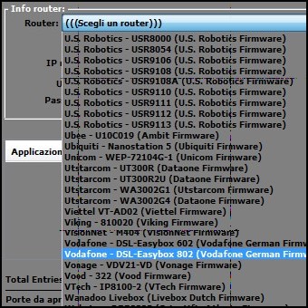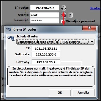 | 7. Andiamo nel riquadro Info router e dal menu Router selezioniamo il modello del router (nel nostro caso il Vodafone – Easybox 802) che usiamo per collegarci alla nostra ADSL. Dopo qualche secondo nel piccolo riquadro a destra vedremo comparire l’immagine del router e verranno caricati i parametri relativi ad esso. 8. Controlliamo che l’IP del router (IP router) sia quello corretto (ad esempio 192.168.25.2): per rilevare automaticamente l’IP del router e del PC clicchiamo sul tasto accanto al box. Facciamo lo stesso controllo per Utente e Possword (il software visualizza le credenziali di default usate dal nostro modello). | ||
