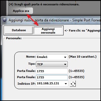 | 9. Anche se non è necessario è possibile, prima di programmare il router, verificare di aver usato le porte giuste (impostate al passo 1). Il software consente di visualizzare le regole programmate nel router ed eventualmente eliminarle: cliccando su Visualizza/Rimuovi porte attuali. 10. Nel pannello a destra, in Scegli quali porte è necessario riderezionare, premiamo Applica ora. Poi, nel tab Aggiungi Personale digitiamo eMule1 in Nome, scegliamo TCP in Tipo, in Porta iniziale e Porta finale inseriamo la porta TCP (1755) usata al Passo 1, in Indirizzo IP digitiamo l’IP del PC con eMule e premiamo Aggiungi. | ||