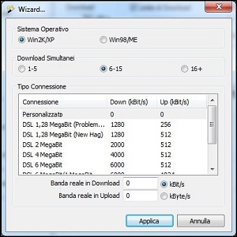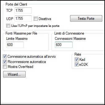 | 1. Avviamo Emule e clicchiamo il pulsante Opzioni e spostiamoci nella sezione Connessione. In Porte del Client digitiamo 1755 in TCP e 1755 in UDP (che in seguito apriremo nel Router), in Fonti Massime per File e Limite di Connessione digitiamo 600 e lasciamo invariate le altre opzioni predefinite. 2. Clicchiamo sul pulsante Wizard e impostiamo Win2K/XP come sistema operativo e in Download simultanei scegliamo 6-15. In tipo di connessione selezioniamo Personalizzato e digitiamo i valori reali in Kbit/s di Download e Upload della nostra ADSL (misuriamoli da speedtest.net cliccando sull’icona del server di Roma), infine premiamo Applica. | ||