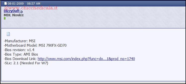 | A questo punto portiamoci sul forum Mydigitallife effettuiamo una brave registrazione e spostiamoci nella sezione “Bios Mod Requests.Post Requests Only”. Individuiamo la sezione appropriata (AMI, Phoenix ecc..) e apriamo un Thread, simile a quello dell’immagine, inserendo le informazioni raccolte al passo precedente. Nel giro di 24/48 ore lo SLIC del BIOS verrà modificato e verrà pubblicato il rispettivo link al download con le informazioni necessaria per l’aggiornamento. | ||