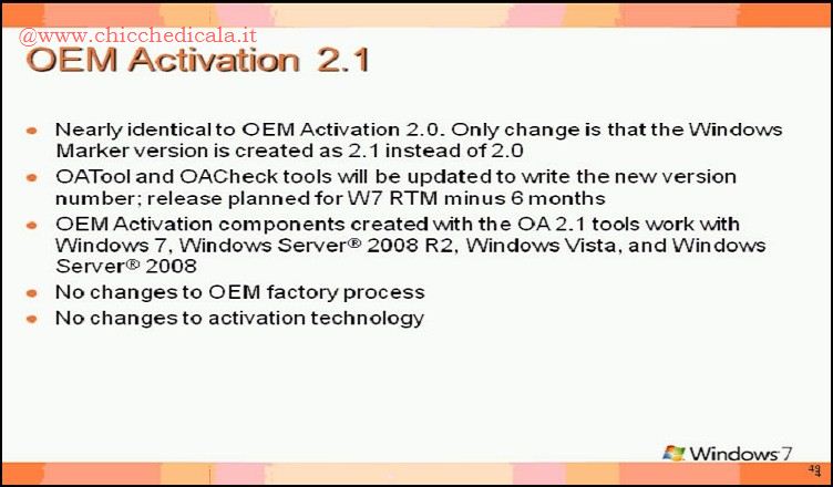 Il processo di attivazione per la versione OEM SLP 2.1 opera in maniera molto simile all’attivazione OEM SLP 2.0. Microsoft non ha apportato alcun cambiamento di tecnologia per l’attivazione, infatti l’unica modifica è la versione “Windows Marker” da 2.0 a 2.1. Anche il certificato digitale, che ha estensione Xrm-ms, firmato da Microsoft con una chiave pubblica OEM SLIC (0 × 9C bytes), una chiave privata e un OEMID della tabella SLIC, è immutato. | ||