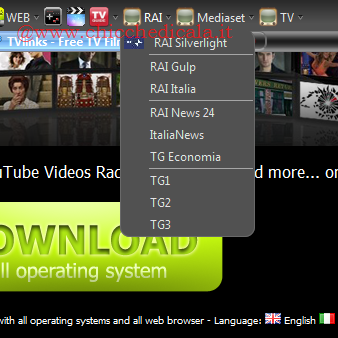| 3. Cliccando su Rai possiamo accedere tutti i canali della TV di Stato. Con RaiSilverlight si apre una finestra sul sito Web da cui è possibile avviare lo streaming. Con gli altri Canali Rai possiamo aprire i vari canali su un player esterno e \t\tscegliere dal menu a tendina quello da visualizzare. Possiamo passare anche alla visualizzazione a schermo intero. 4. Il pulsante Mediaset ci permette di visualizzare Canale 5, Italia 1 e Re te 4. Spesso, però, i link diretti potrebbero non funzionare e le finestre si aprono inutilmente. Quello che funziona con una certa affidabilità è il primo della lista che apre una finestra su Canale 5. | ||