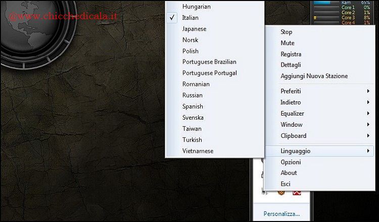 | 1. Una volta scaricato RadioSure, sia esso in versione Portable o Installer sarà necessario impostare la lingua Italiana. Per farlo clicchiamo col tasto destro sull’icona presente nella system Tray e dal menu selezioniamo Language/Italian. Automaticamente senza necessita di riavviare il software visualizzeremo l’interfaccia in lingua italiana. | ||