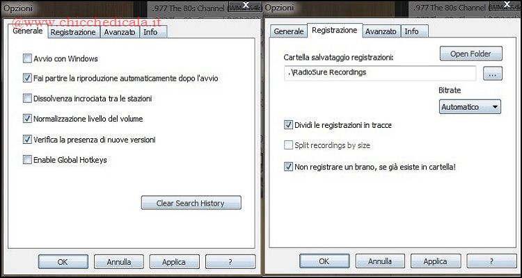| 4. Tramite il pulsante Opzioni avremo accesso alle impostazioni del software. Nel menu Generale possiamo togliere la spunta alla voce Avvia con Windows, e spuntare l’opzione Verifica presenza di nuove versioni. Nel menu Registrazione non dobbiamo fare nulla, a meno che non vogliamo cambiare la cartella dove verranno salvati i file MP3, in tal caso clicchiamo sul pulsante apposito e selezioniamo un percorso diverso. Il pulsante OpenFolder aprirà la cartella dove vengono salvati i brani MP3 per poterli esportare sul lettore MP3 Portatile, penna USB o altra periferica. | ||