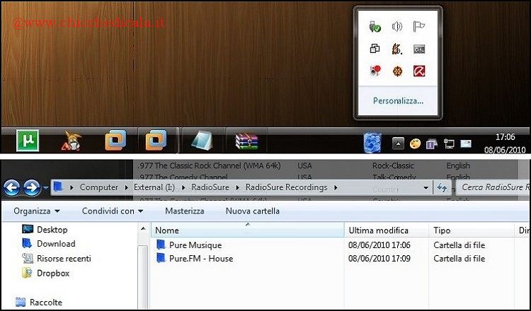 | 5. Per registrare una stazione basterà cliccare il pulsante Registra dall’interfaccia principale di RadioSure. Durante la registrazione nel display a barre e nell’icona comparirà un punto rosso lampeggiante. I brani registrati verranno salvati automaticamente nella directory selezionata al passo precedente e ogni stazione radio avrà una sua cartella personale contenente i brani MP3. Fra questi ci saranno anche quelli inutili del parlato, quindi dovremo effettuare una cernita manuale. | ||