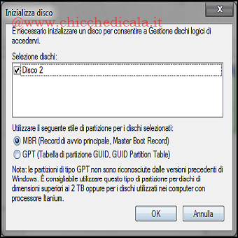 | 3. Immediatamente comparirà un nuovo disco non inizializzato e non ancora formattato. Per prima cosa bisogna inizializzarlo: clicchiamo col tasto destro sul disco e poi su “Inizializza Disco”. 4. Nella finestra successiva selezioniamo solo l’opzione MBR e premiamo OK. | ||