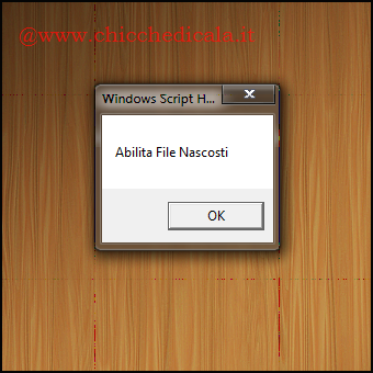 | 3. Terminata l’operazione, tenendo premuto il tasto SHIFT, clicchiamo col tasto destro su un’area vuota del desktop per vedere comparire la voce Abilita-Disabilita File Nascosti. 4. Selezionado l’opzione comparirà una piccola finestra pop-up che avvisa l’utente che i file nascosti sono stati abilitati. Perchè le modifiche abbiano effetto è necessario effettuare un refresh col tasto F5. Per disabilitare i file nascosti basterà semplicemente un secondo clic sull’opzione Abilita-Disabilita File Nascosti. NOTA: Per tutti colore che chiedono di citare la fonte, rispondo che non è possibile perchè lo script è scritto da me. Non ci vogliono certo anni di studio per buttare giù due righe di codice così semplice. Anzi per tutti colore che volessero scrivere script così basilari vi consiglio questa guida pubblicata su HTML.it. | ||