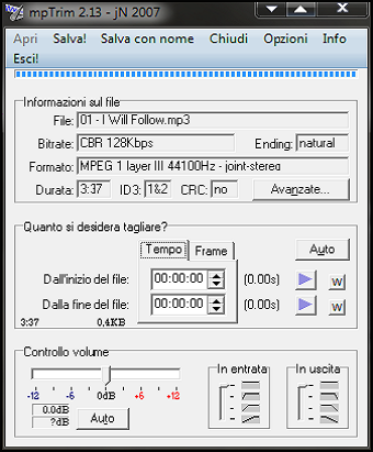 | 1. MPTrim è un software che non richiede installazione. È sufficiente fare doppio clic sul file mpTrim.exe, dopo averlo estratto dall’archivio compresso. Oltre all’eseguibile del software alla pagina seguente noteremo la presenza del file Italian. Un clic destro salva con nome per procedere col download di Italian.mpTrim.ini che ci permetterà di utilizzare MPTrim in lingua italiana, comprendendo meglio i significati delle varie opzioni. Per un corretto funzionamento, i due file devono trovarsi nella stessa cartella. In caso contrario, il software si avvierà in lingua inglese. 2. Eseguiamo il programma, clicchiamo sul pulsante Apri e cerchiamo il brano in MP3 che desideriamo restaurare. Se il file è danneggiato riceveremo un messaggio di avviso. Caricato il brano nel software, potremo visualizzare le informazioni sul codec utilizzato, sul bitrate di conversione (qualità dell’MP3), sulla durata complessiva del brano, ecc. | ||