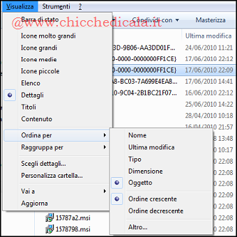 | 1. Clicchiamo sul pulsante Start e nel menu Esegui (Windows + R), digitiamo installer seguito da OK. Con questo processo viene aperta la cartella %windir%\Installer. Scegliamo Dettagli dal menu Visualizza. Per utilizzare il menu Visualizza in Windows Vista/Seven, è necessario premere prima ALT per visualizzare la barra dei menu, quindi cliccare sul menu Visualizza e selezionare Dettagli. Successivamente scegliamo Ordina per, quindi clicchiamo su Oggetto. Se non fosse presente selezioniamo Altro.. e spuntare l’opzione Oggetto. NOTA: è possibile che venga visualizzata la finestra di dialogo di Controllo dell’account utente, scegliamo Consenti quando viene visualizzato il messaggio di avviso. 2. Clicchiamo con il pulsante destro del mouse su ogni file con estensione msi in cui l’oggetto è “Microsoft Office Nome_Prodotto 2010“, quindi scegliamo Disinstalla. NOTA: Nome_prodotto è un segnaposto che dovrà essere sostituito con il nome del prodotto Microsoft Office 2010. | ||