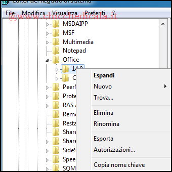 | 9. Premiamo contemporaneamente i tasti Windows + R e digitiamo regedit seguito da OK. Clicchiamo sulla seguente sottochiave del Registro di sistema: HKEY_CURRENT_USER\Software\Microsoft\Office\14.0 10. Scegliamo Elimina dal menu Modifica, quindi scegliamo Sì per confermare l’eliminazione. Per ogni sottochiave del Registro di sistema presente nell’elenco seguente, ripetiamo la procedura sopracitata: –Versioni a 32 bit di Windows: HKEY_CURRENT_USER\Software\Microsoft\Office\14.0 –Versioni a 64 bit di Windows: HKEY_CURRENT_USER\Software\Microsoft\Office\14.0 NOTA: Nelle seguenti chiavi del Registro di sistema, il carattere asterisco (*) rappresenta uno o più caratteri nel nome della sottochiave. Riavviamo il computer. Se la disinstallazione è stata eseguita correttamente, la procedura è terminata e, se necessario, è possibile reinstallare Microsoft Office System 2010. | ||