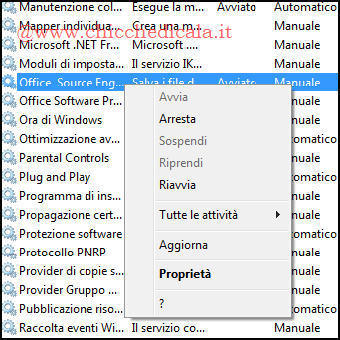 | 3. Clicchiamo sul pulsante Start e nella casella di ricerca o nel menu Esegui digitiamo services.msc seguito da INVIO. Nella finestra Servizi determiniamo se i servizi Office Source Engine e Office Software Protection Platform sono in esecuzione. Se questi servizi sono in esecuzione clicchiamo con il pulsante destro del mouse, selezioniamo Arresta e chiudiamo la finestra Servizi. 4. Clicchiamo sul pulsante Start e nella casella di ricerca o nel menu Esegui digitiamo %CommonProgramFiles%\Microsoft Shared. Se presenti, eliminiamo le seguenti cartelle: