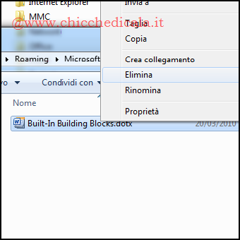 | 7. Clicchiamo sul pulsante Start e nella casella di ricerca o nel menu Esegui digitiamo %appdata%\microsoft\document building blocks\. Se utilizziamo la versione in lingua italiana di Microsoft Office System 2010 visualizzeremo il valore ID 1040. Apriamo la sottocartella in tale percorso ed eliminiamo il file Building blocks.dotx. 8. Clicchiamo sul pulsante Start e nella casella di ricerca o nel menu Esegui digitiamo %temp% seguito da INVIO. Selezioniamo tutto il contenuto ed eliminiamolo tramite il menu contestuale. Successivamente clicchiamo sul pulsante Start e nella casella di ricerca o nel menu Esegui digitiamo %AllUsersprofile%\Application Data\Microsoft\Office\Data seguito da INVIO. Se presente individuiamo ed eliminiamo solo il file Opa14.dat. | ||