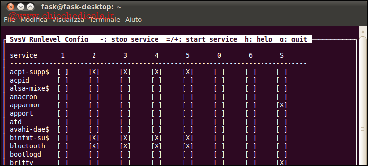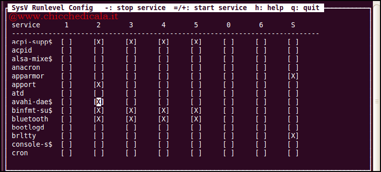| 2. Nella riga in alto troviamo elencati i runlevel mentre nella colonna a sinistra i servizi disponibili. Il runlevel di default su Ubuntu è il 2. Per fare in modo che un servizio non venga avviato, quindi, debbiato cancellarlo da questo runlevel. Per disattivare un servizio attivo premiamo la barra spaziatrice. | ||