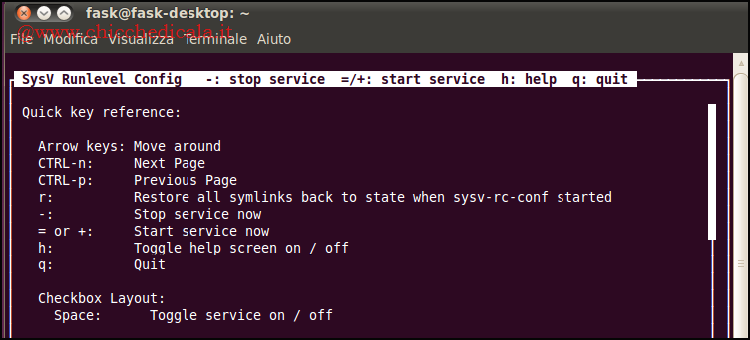 | 4. Per attivare immediatamente un servizio, selezioniamo questo con i tasti cursore e premiamo “+“. Per disattivarlo, invece, premiamo “–“. Premendo il tasto “h” ci verrà mostrata una schermata di aiuto con elencati tutti i tasti disponibili. Per uscire da sysv-rc-conf, quindi, premiamo il tasto “q“. | ||