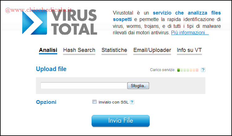 | 2. Ora la cosa diventa ancora più facile! clicchiamo su Invia File per inviare il file alla centrale di controllo e, dopo una brave attesa avremo il responso che stiamo cercando. Il tempo necessario al completamento di questa fase, dipende dalla dimensione del file e dalla velocità della nostra connessione internet. | ||