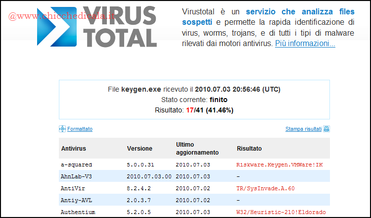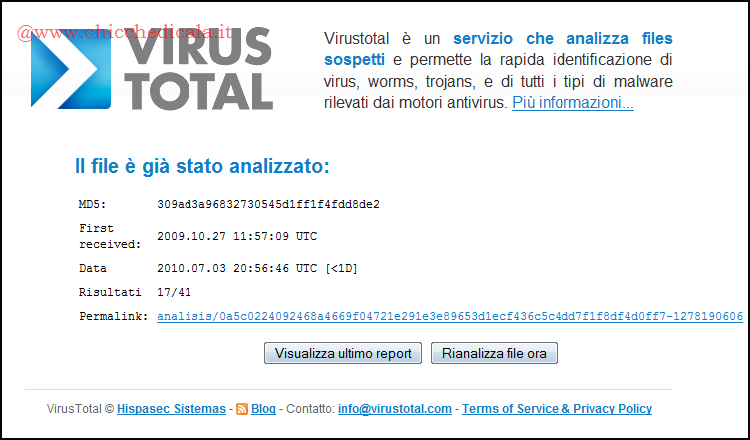 | In linea generale, ogni antivirus individua tutti i codici virali in circolazione, ma ciascuno utilizza dei metodi diversi che possono risultare efficaci in certe situazioni e meno in altre. Per essere più sicuri, si dovrebbero quindi provare tutti i siti di scansione on-line, ma alla fin fine ciò che interessa è pulire i file infetti. Una volta che sono stati individuati ed abbiamo il nome del virus, possiamo cercare una risposta mirata. Ecco perchè oltre agli appositi tool di pulizia, che si possono scaricare dai maggiori produttori di antivirus, esistono anche dei siti specializzati nella scansione con più software antivirali del file inviato. Su www.virustotal.com ci è permesso caricare un file sospetto, per controllarlo in tempo reale con tutti i più diffusi antivirus, aggiornati all’ultima versione. | ||