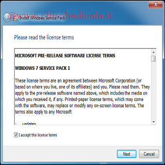 | 1. Una volta scaricato il file sul nostro computer, avviamolo cliccando due volte su di esso. Fatto questo, \t\tclicchiamo sul pulsante Esegui e poi su Continua (next) per avviare la procedura guidata d’installazione del Service Pack 1 per Windows 7. Proseguiamo cliccando su Avanti (next). 2. Dopo aver letto le condizioni di licenza, spuntiamo la casella Accetto le condizioni di licenza, quindi clicchiamo su Avanti (next). Nella schermata successiva, lasciamo selezionata la casella Riavvia il computer automaticamente. Bene, ora non ci resta che cliccare su Installa (Install). | ||