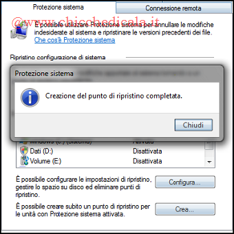 | 3. Quando viene visualizzato il messaggio di conferma Creazione del punto di ripristino completata, clicchiamo sul tasto OK per tornare al pannello Protezione di sistema. Per verificare adesso l’effettiva creazione del punto di ripristino, clicchiamo sul pulsante Annulla nelle schermate successive. 4. Riapriamo la schermata Ripristino configurazione di sistema da Start/Tutti i programmi/Accessori/Utilità di sistema/Ripristino configurazione di sistema. Clicchiamo Continua, spuntiamo Scegli un punto di ripristino diverso e premiamo Avanti. Il punto di ripristino compare in cima alla lista. NOTA: In alternativa potete aggiungere la voce Crea Punto di Ripristino al tasto destro del mouse seguendo questa procedura. | ||