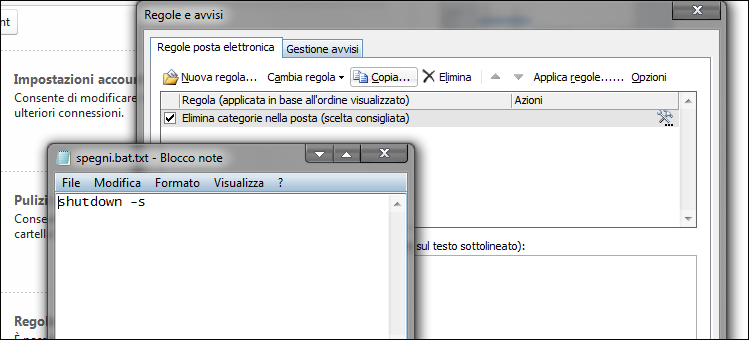 | 1. Apriamo il Blocco note da Start/Tutti i Programmi/Accessori e digitiamo la scritta shutdown -s. Quindi salviamo il file come spegni.bat in una cartella dell’hard disk a nostro piacimento. Fatto questo, avviamo Outlook, selezioniamo la voce File/Impostazioni/Gestisci regole e avvisi e clicchiamo su Nuova Regola. | ||