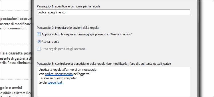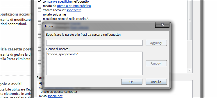 | 3. Indichiamo il testo da cercare nell’oggetto, ad esempio codice_spegnimento, clicchiamo su Aggiungi e poi su OK. Tornati nella schermata Creazione guidata Regole clicchiamo su Avanti. Nel passaggio successivo spuntiamo la voce avvia applicazione e, in Passaggio 2, clicchiamo su applicazione. | ||