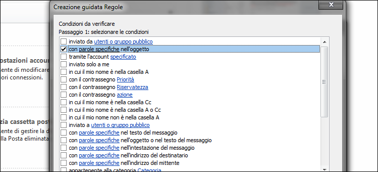 | 2. Nella schermata Creazione guidata Regole che appare evidenziamo la voce Applica regola ai messaggi ricevuti e clicchiamo sul pulsante Avanti. Tra le varie opzioni proposte, attiviamo solamente con parole specifiche nell’oggetto. Spostiamoci ora nella sezione Passaggio 2 e selezioniamo il link parole specifiche. | ||