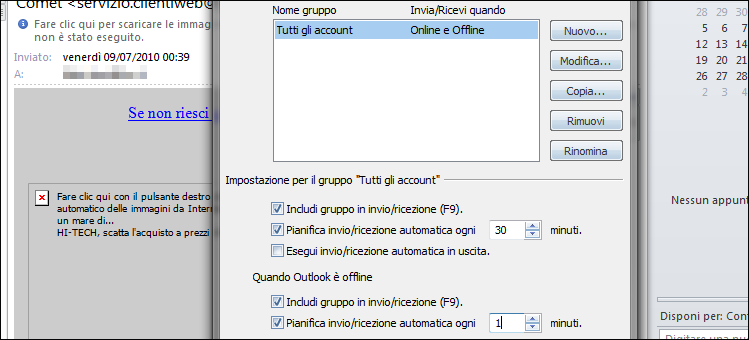| 5. Tornati nella schermata Regole e Avvisi clicchiamo su Applica/OK per rendere attivo il filtro appena creato. Accediamo al menu InviaRicevi/Gruppo di InvioRicezione/Definisci gruppi di InvioRicezione, spuntiamo Pianifica Invio/Ricezione automatica e impostiamo i minuti su 1. | ||