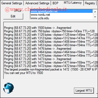 | 3. Per verificare che il sistema automatizzato applichi valori accettabili per il nostro computer selezioniamo la linguetta MTU/Latency. Clicchiamo sul pulsante Largest MTU e attendiamo il termine del test. La scritta You can set your MTU to 1500 ci fornisce il limite massimo da non superare. 4. Andiamo su General Settings e in Connection Speed selezioniamo la velocità della nostra linea ADSL. Ad esempio, per una 4 Mbps scegliamo 4,000 Kbps. Mettiamo una spunta su Optimal e su Modify All Network Adapters. Verifichiamo che il valore MTU sia entro il limite calcolato con il test precedente. Clicchiamo infine Apply Changes e riavviamo il PC con Sì. | ||