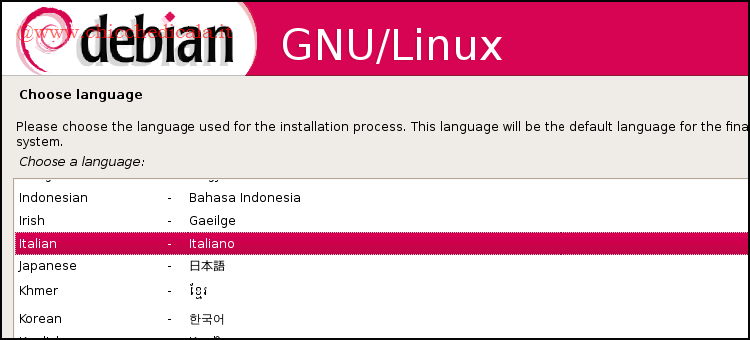 | 2. Attendi il caricamento dell’ambiente grafico, operazione che non dovrebbe richiedere più di qualche secondo. Il primo passo è scegliere la lingua italiana. Scorri l’elenco delle lingue che appare su schermo e seleziona Italiano. Clicca su Continua sia per la scelta della lingua sia per la scelta della nazione. | ||