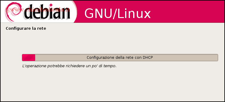 | 4. In questa fase non devi fare nulla. Il programma di installazione controlla automaticamente il tuo PC alla ricerca delle periferiche principali, ovvero il lettore DVD da cui stai installando Debian, la presenza di eventuali schede di rete e il tipo di scheda audio e video presente. | ||