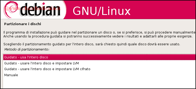| 7. Il passo successivo è partizionare il disco fisso prima della copia dei file. Questa fase è molto importante e va dedicata ad essa la cura necessaria. Nel tutorial utilizzeremo il partizionamento guidato, adatto ad utenti alle prime armi, ma per completezza, ti mostreremo anche la procedura di partizionamento manuale. | ||
