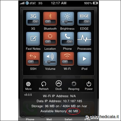| MAGGIORI INFORMAZIONI: Per velocizzare al meglio l’iPhone è consigliabile non avere attivi temi di nessun genere o usare troppe estensioni del Mobile Substrate che si succhiano la memoria. | ||